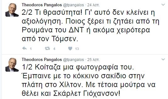Μετά τις γραβάτες, ή μάλλον την απουσία τους, σειρά πήραν τα... σακίδια που χαλάνε την αισθητική του Θόδωρου Πάγκαλου, για να ακολουθήσει ένα θλιβερό υπονοούμενο για τον Ευκλείδη Τσακαλώτο και τον Πολ Τόμσεν.