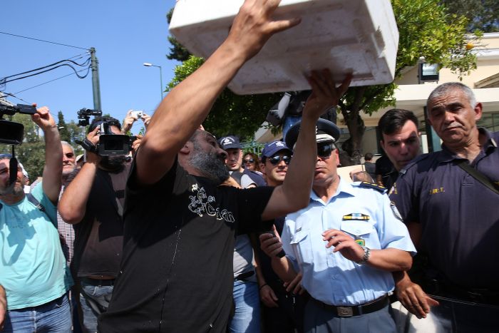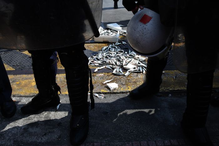Μάλιστα, οι διαδηλωτές πέταξαν μπροστά από τη Βουλή και μία κασέλα με ψάρια, διαμαρτυρόμενοι για τα μέτρα λιτότητας που προωθεί η κυβέρνηση.