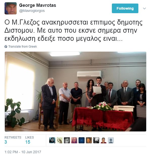 Σημειώνεται ότι ο Μανώλης Γλέζος λίγη ώρα αργότερα ανακηρύχθηκε επίτιμος δημότης Διστόμου.