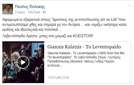 Σε δεύτερη ανάρτησή του αφιερώνει το τραγούδι «το λεβεντόπαιδο» του Γιαννη Καλατζη, στους «άριστους της αντιπολίτευσης απ τα Lidl», όπως γράφει χαρακτηριστικά.