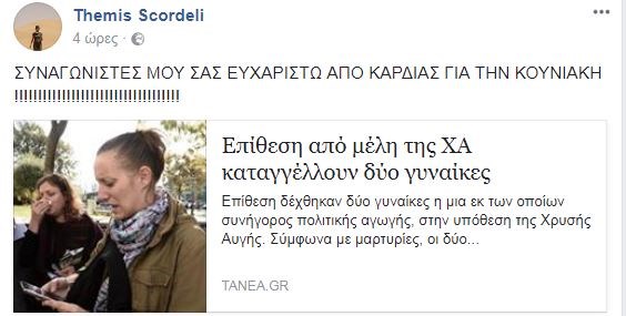Η Θέμις Σκορδέλη το καλοκαίρι καταδικάστηκε σε φυλάκιση τριών ετών, με τριετή αναστολή, για ηθική αυτουργία σε επίθεση που δέχτηκε ένας μετανάστης, το 2011, στον Άγιο Παντελεήμονα, με αποτέλεσμα ο τελευταίος να νοσηλευθεί.