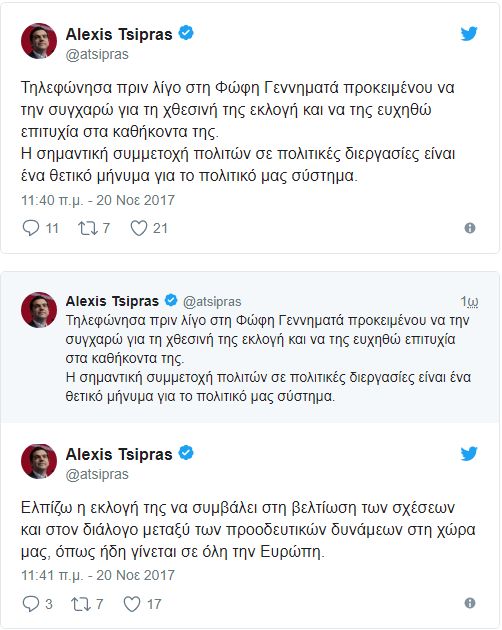 Με ανάρτησή του στο Twitter, ο κ. Τσίπρας εκφράζει την ελπίδα του, «η εκλογή της κ. Γεννηματά να συμβάλει στη βελτίωση των σχέσεων και στο διάλογο μεταξύ των προοδευτικών δυνάμεων στη χώρα μας, ενώ χαιρετίζει εξάλλου τη συμμετοχή των πολιτών σε πολιτικές διεργασίες».