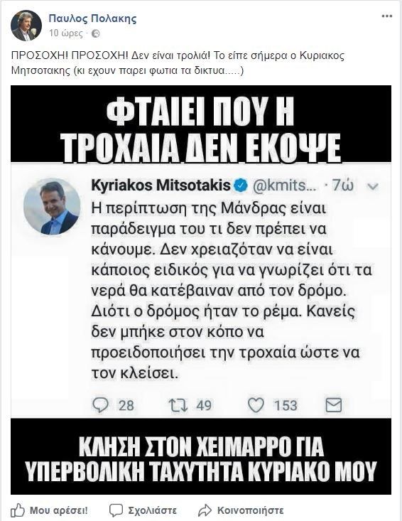 Μέσω Facebook έκανε το σχόλιό του ο κ. Πολάκης: «ΠΡΟΣΟΧΗ! ΠΡΟΣΟΧΗ! Δεν είναι τρολιά! Το είπε σήμερα o Κυριάκος Μητσοτάκης (κι έχουν πάρει φωτιά τα δίκτυα…..)», έγραψε ο αναπληρωτής υπουργός Υγείας και προσέθεσε:«Φταίει η τροχαία που δεν έκοψε κλήση στον χείμαρρο για υπερβολική ταχύτητα Κυριάκο μου».