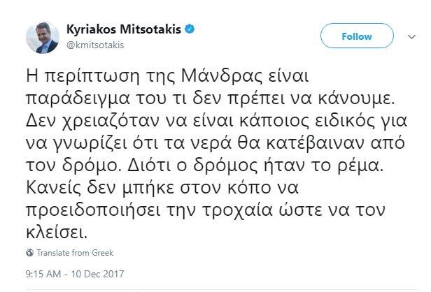 Ο Κυριάκος Μητσοτάκης «τιτίβισε» πως «η περίπτωση της Μάνδρας είναι παράδειγμα του τι δεν πρέπει να κάνουμε. Δεν χρειαζόταν να είναι κάποιος ειδικός για να γνωρίζει ότι τα νερά θα κατέβαιναν από τον δρόμο. Διότι ο δρόμος ήταν το ρέμα. Κανείς δεν μπήκε στον κόπο να προειδοποιήσει την τροχαία ώστε να τον κλείσει».