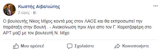 Σύμφωνα όμως με τα λεγόμενα του εκπροσώπου του ΛΑΟΣ, Κωστή Αϊβαλιώτη, στο Facebook, ο Μίχος θα εκπροσωπεί στη Βουλή το νέο του κόμμα.