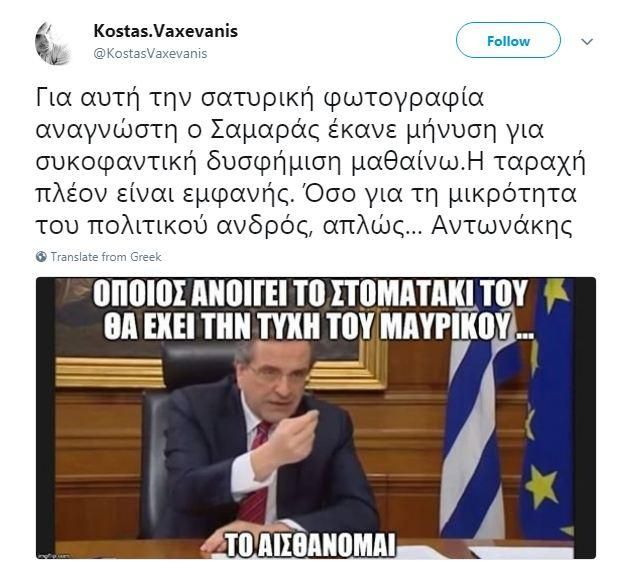 «Για αυτή την σατυρική φωτογραφία αναγνώστη ο Σαμαράς έκανε μήνυση για συκοφαντική δυσφήμιση μαθαίνω.Η ταραχή πλέον είναι εμφανής. Όσο για τη μικρότητα του πολιτικού ανδρός, απλώς... Αντωνάκης», έγραψε ο Κώστας Βαξεβάνης.