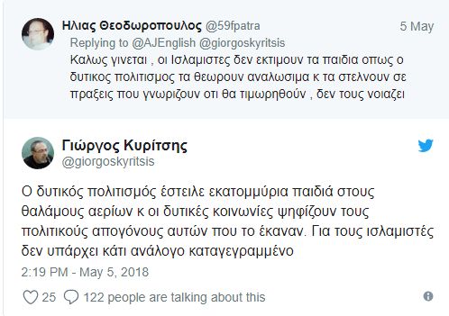 Σε αυτά τα στοιχεία, χρήστης του Twitter θεώρησε ορθό να σημειώσει πως ο Ισραηλινός στρατός καλώς πράττει, καθώς οι «Ισλαμιστές» (κατά τον ίδιο, όλοι οι Παλαιστίνιοι είναι Ισλαμιστές και όχι μουσουλμάνοι, όπως είναι το θρήσκευμα) δεν εκτιμούν την ανθρώπινη ζωή.