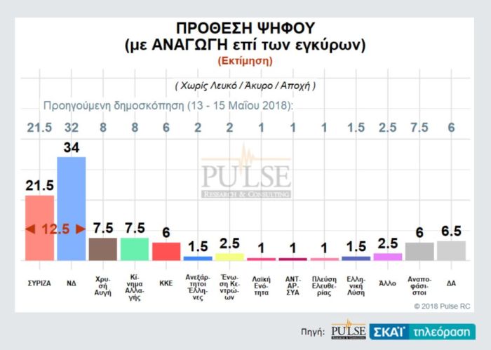 Προβάδισμα 12,5 μονάδων δίνει στη Νέα Δημοκρατία έναντι του ΣΥΡΙΖΑ νέα δημοσκόπηση της Pulse για λογαριασμό του τηλεοπτικού σταθμού ΣΚΑΪ.