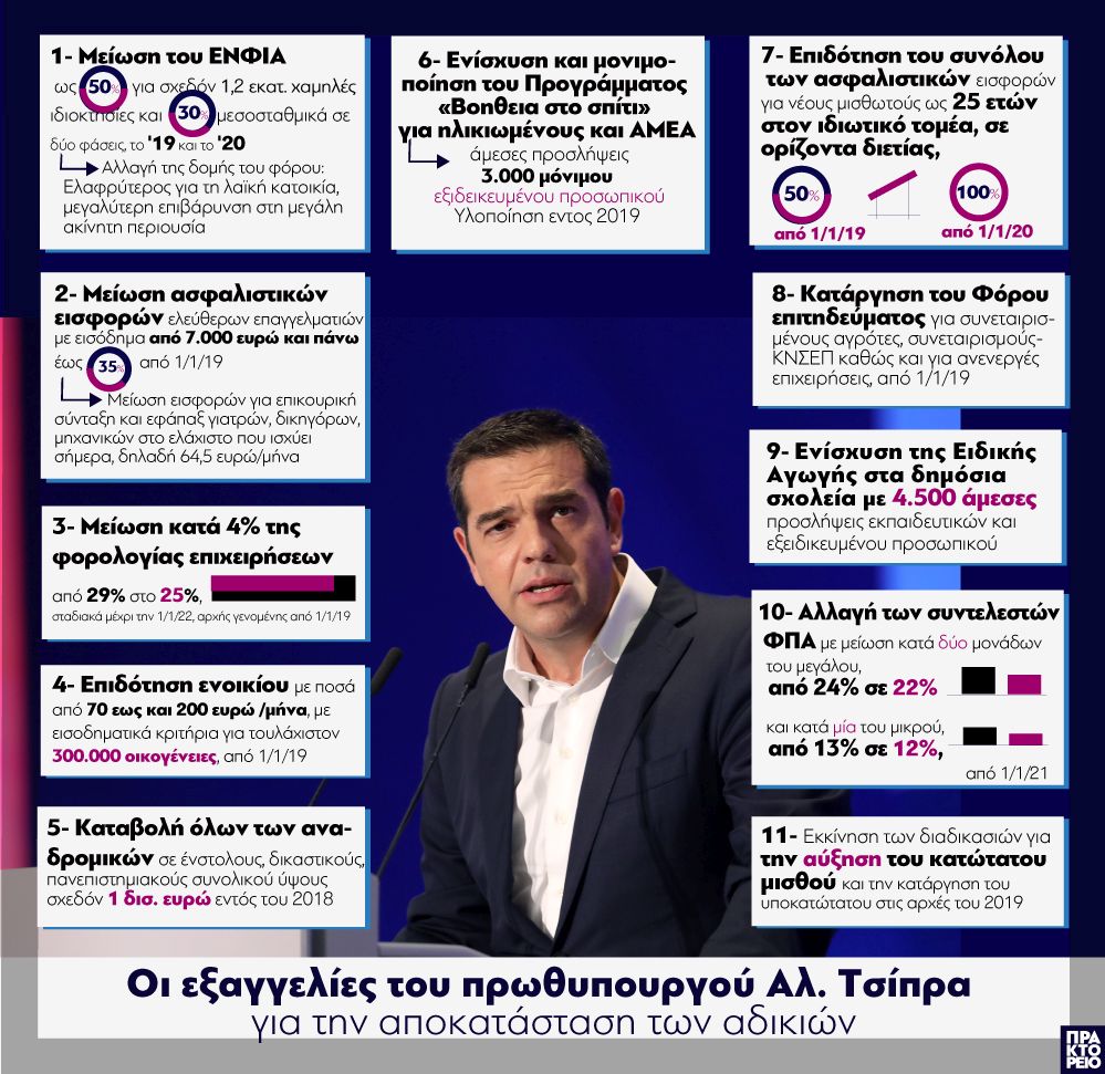 1) Μείωση του ΕΝΦΙΑ ως 50% για σχεδόν 1,2 εκατ. χαμηλές ιδιοκτησίες και 30% μεσοσταθμικά σε δυο φάσεις, το '19 και το '20. Το μέτρο θα νομοθετηθεί ως το τέλος του χρόνου. Παράλληλα θα αλλάξει και η δομή του φόρου ώστε να γίνει πιο αναλογικός και ελαφρύτερος για τη λαϊκή κατοικία με μεγαλύτερη επιβάρυνση στη μεγάλη ακίνητη περιουσία.