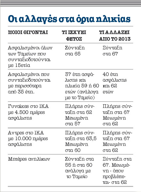 - Από 1ης Ιανουαρίου 2013 τα όρια ηλικίας στο Δημόσιο και στα Ταμεία αρμοδιότητας του υπ. Εργασίας (πλην ΝΑΤ) αυξάνονται κατά 2 έτη. Στην πράξη αυτό σημαίνει πως το όριο ηλικίας για συνταξιοδότηση πηγαίνει από το 65ο στο 67ο έτος της ηλικίας, ενώ μειωμένη σύνταξη θα καταβάλλεται στα 62 έτη.