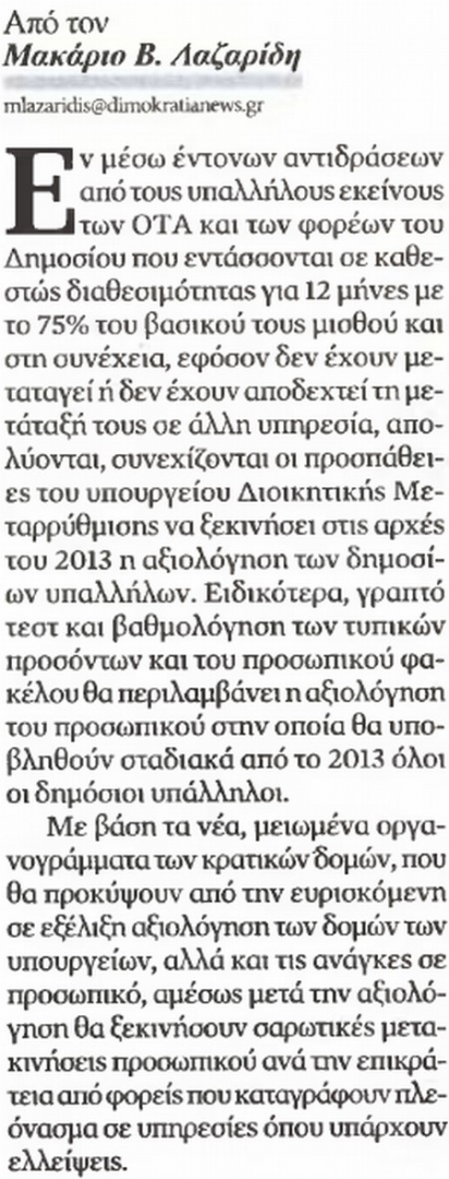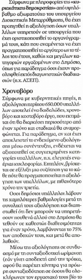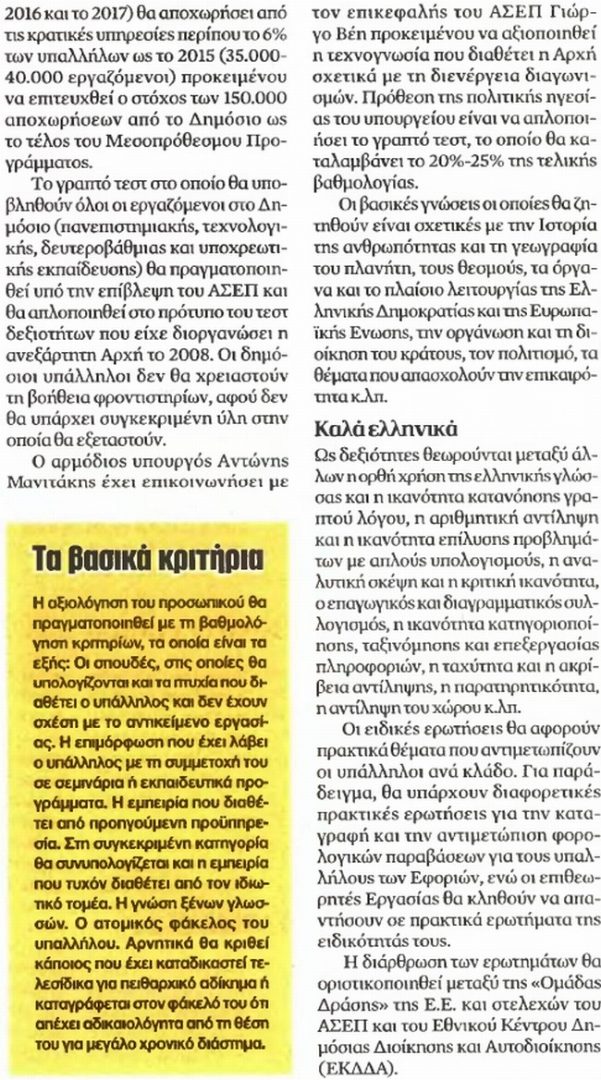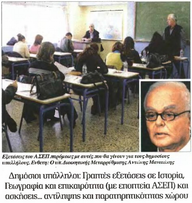 Εξετάσεις του ΑΣΕΠ παρόμοιες με αυτές που θα γίνουν για τους δημοσίους υπαλλήλους. Οι δημόσιοι υπάλληλοι θα υποχρεωθούν να δώσουν εξετάσεις σε Ιστορία, Γεωγραφία και επικαιρότητα (με εποπτεία ΑΣΕΠ) και ασκήσεις... αντίληψης και παρατηρητικότητας χώρου.
