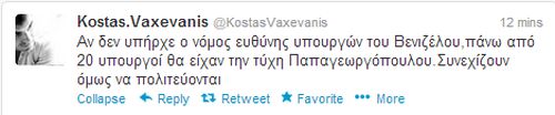 Ο Κώστας Βαξεβάνης στο twitter αναφέρει πως "αν δεν υπήρχε ο νόμος ευθύνης Υπουργών του Βενιζέλου πάνω απο 20 υπουργοί θα είχαν την τύχη του Παπαγεωργόπουλου."