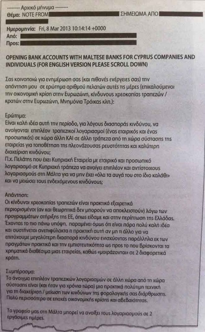 Με το e-mail, που είναι γραμμένο σε αγγλικά και ελληνικά, "συστήνεται ανεπιφύλακτα η πρακτική αυτή", δηλαδή το άνοιγμα λογαριασμών στην Μάλτα, "αν μη τι άλλο για να επιτύχουμε μεγαλύτερη διασπορά κινδύνου, ενισχύοντας παράλληλα εκ των πραγμάτων πρακτικά και την εμπιστευτικότητα ως προς το πού βρίσκονται τα χρηματικά διαθέσιμα μιας εταιρείας, καθώς μοιράζονται σε διαφορετικά μέρη".
