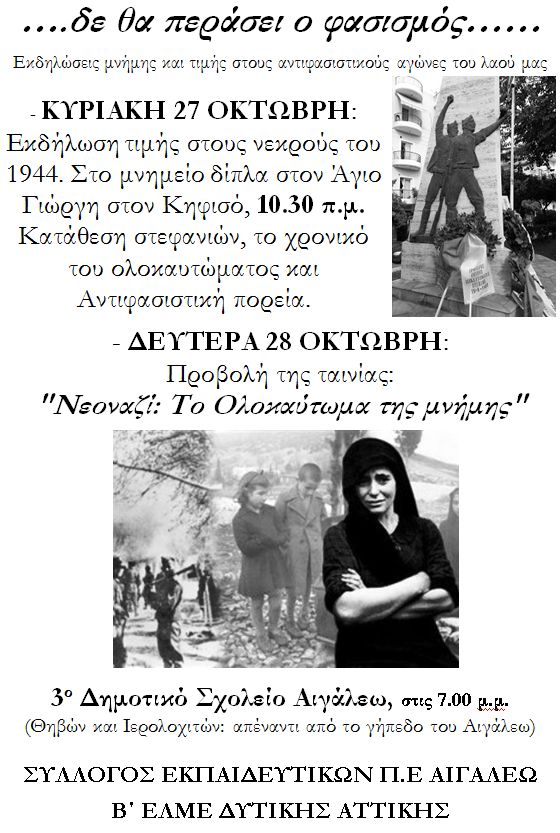21.10.2013 - 08:37 Αντιφασιστικές εκδηλώσεις Συλλόγου ΠΕ Αιγάλεω και Β ΕΛΜΕ Δυτ. Αττικής ΑΝΑΚΟΙΝΩΣΕΙΣ Αντιφασιστικές εκδηλώσεις Συλλόγου ΠΕ Αιγάλεω και Β ΕΛΜΕ Δυτ. Αττικής