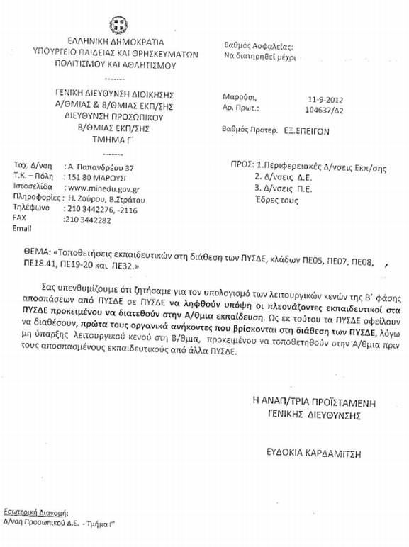 12.09.2012 - 22:42 Υπ. Παιδείας: Διάθεση πλεοναζόντων από ΔΕ στην ΠΕ ΑΝΑΚΟΙΝΩΣΕΙΣ Υπ. Παιδείας: Διάθεση πλεοναζόντων από ΔΕ στην ΠΕ